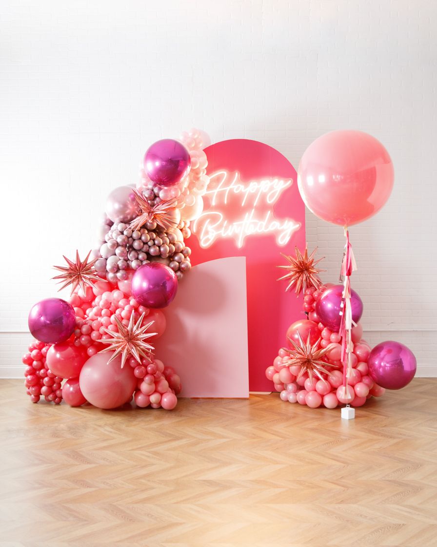 Wow your guests with this sophisticated and stylish backdrop for your teen's birthday! With two panels, a balloon garland, and giant balloon, this will be the ultimate backdrop. Our happy birthday neon sign will help light up the whole look for a Y2K themed birthday!