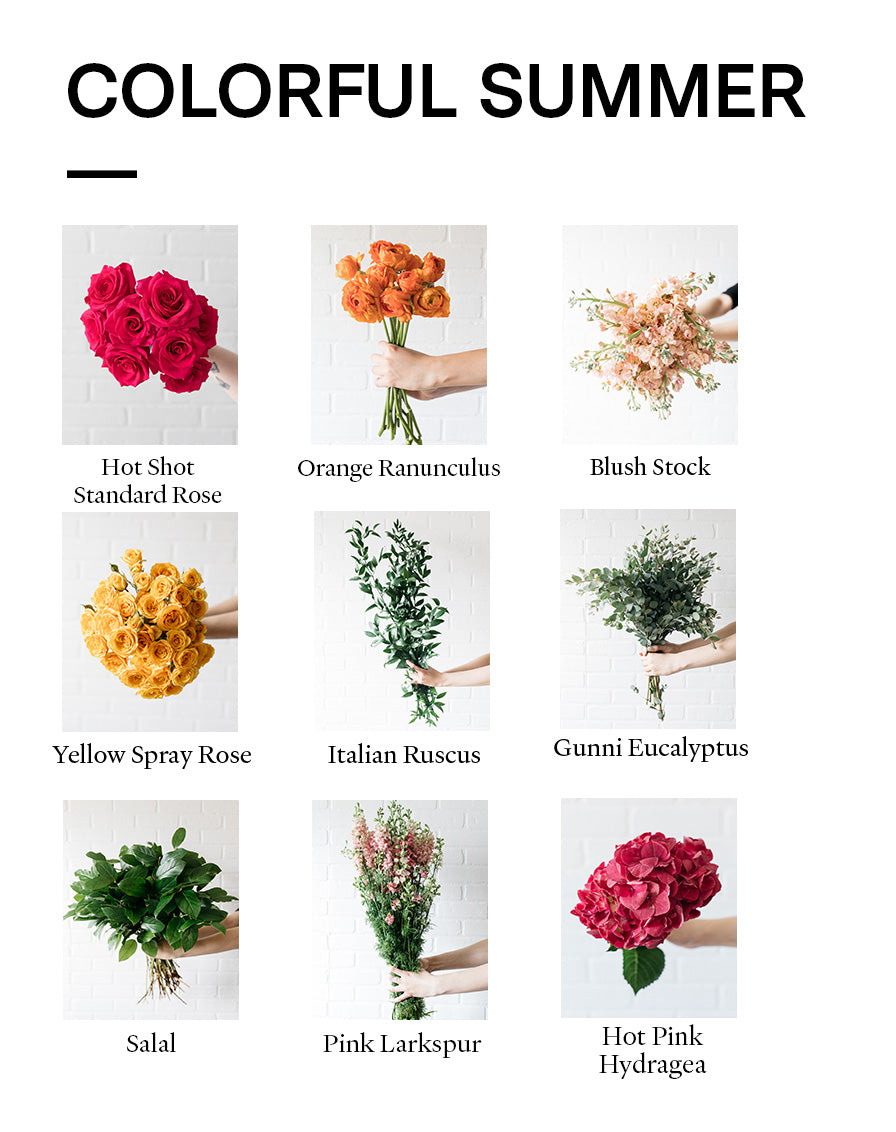 Florals - shades of pinks, oranges, yellows, blush, and greens