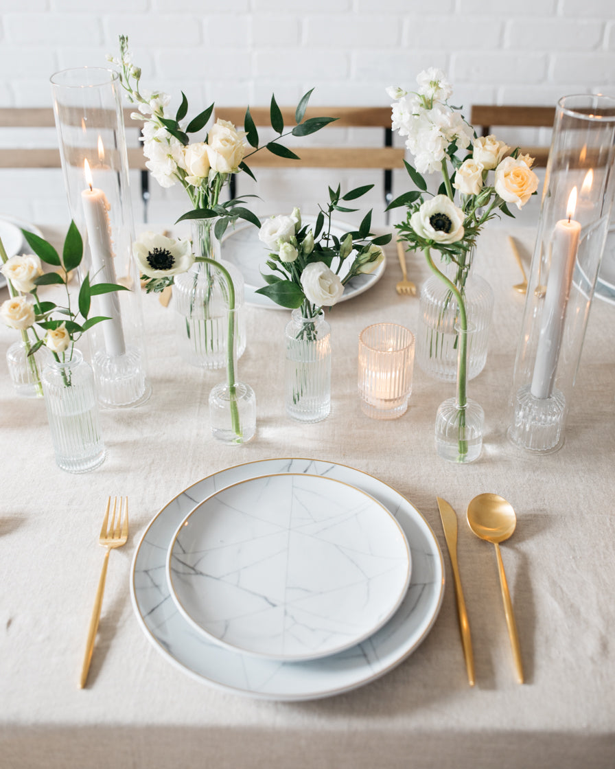 Craft the perfect cocktail table ambiance with our Timeless bud vase sets featuring south-after delicate florals. Personalize your decor by adding votive candles for an elegant touch that complements any setting.