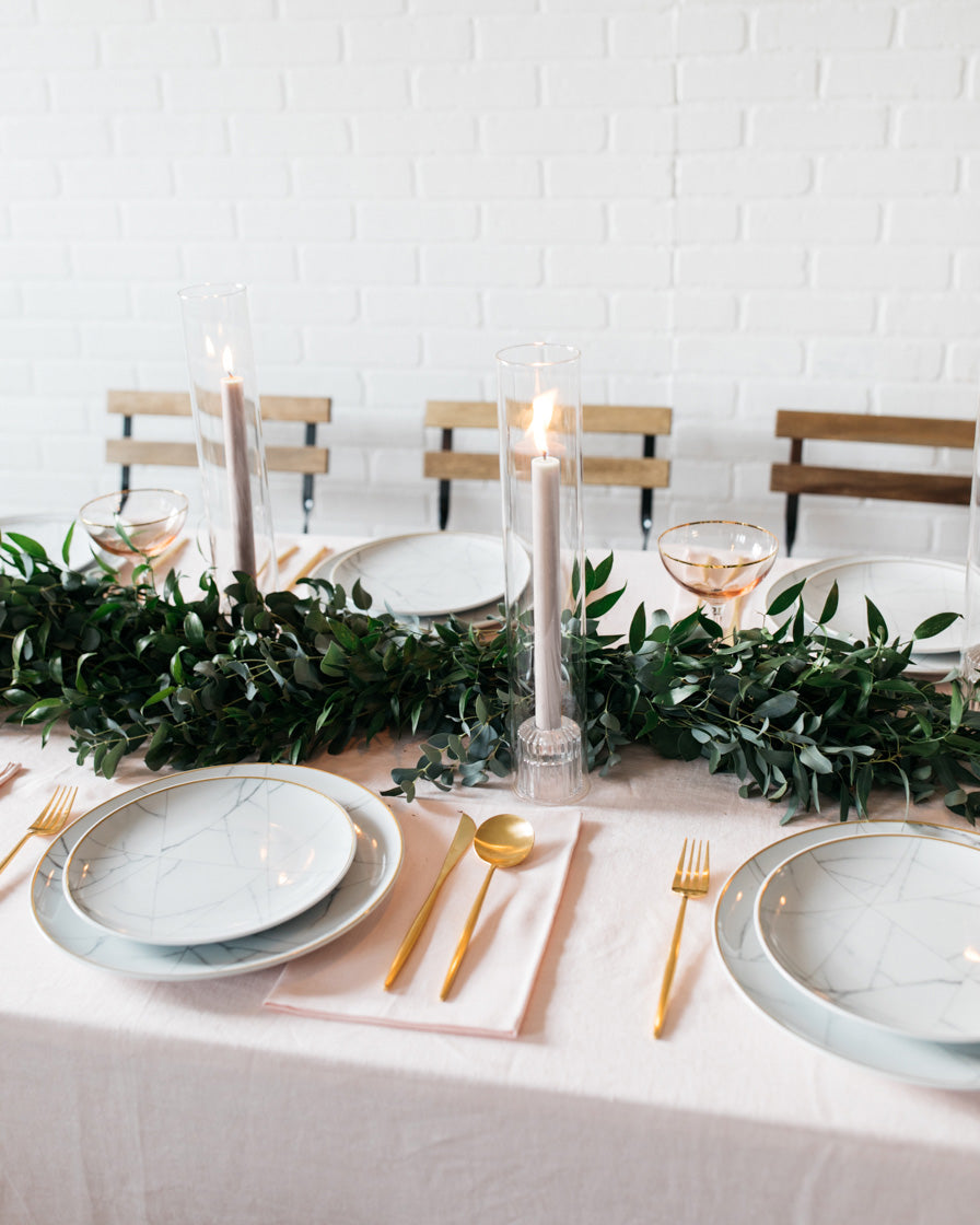 This set features a lush greenery runner that effortlessly spans the table, add some warm light to your centerpiece with the option of clear votive or taper candles. It's the perfect ensemble for creating a modern and effortlessly elegant centerpiece that seamlessly blends lush greenery and the warm glow of candles into your celebration.