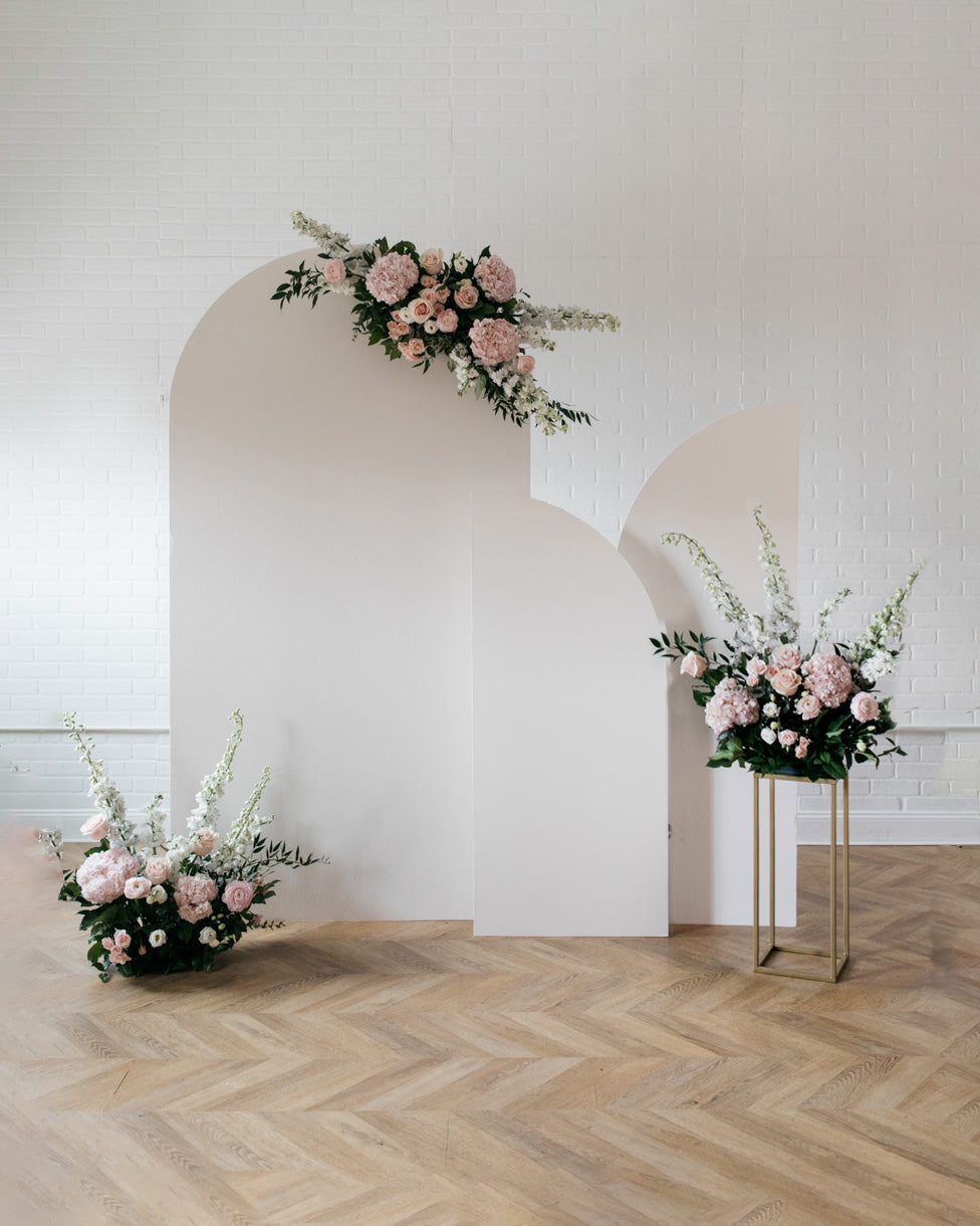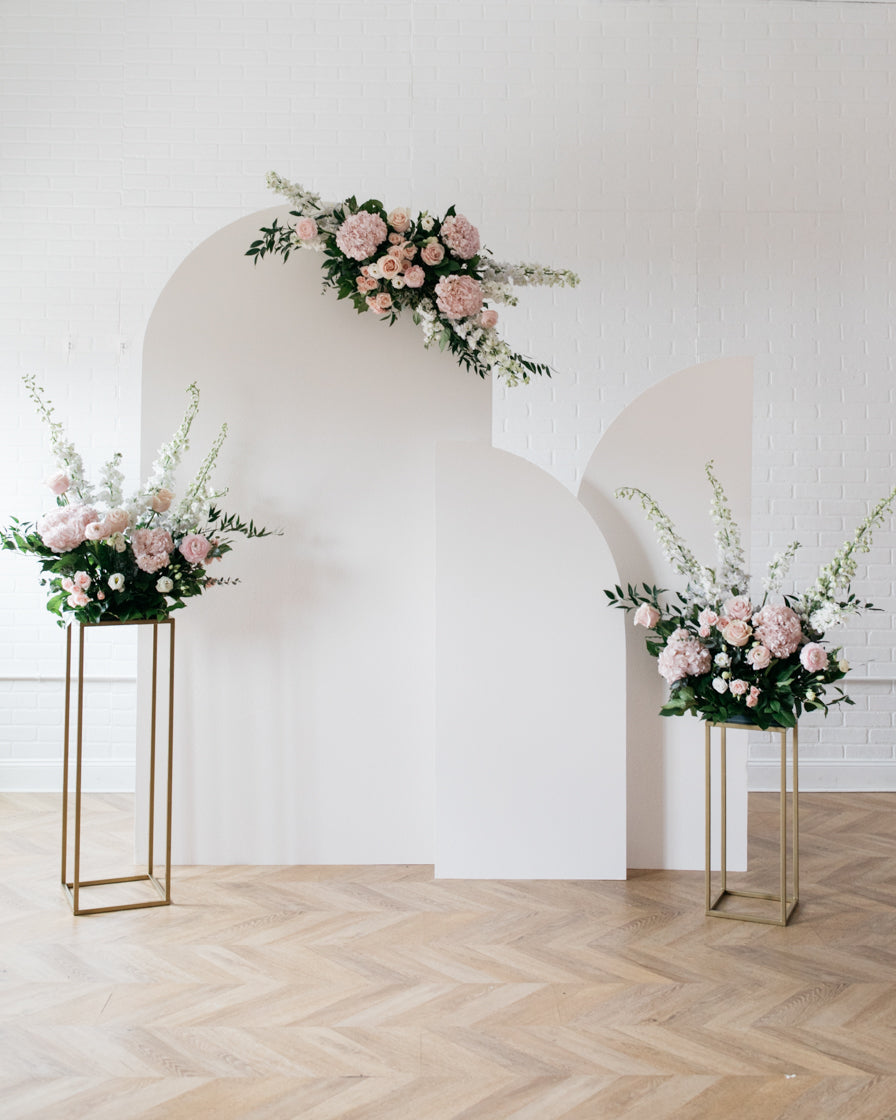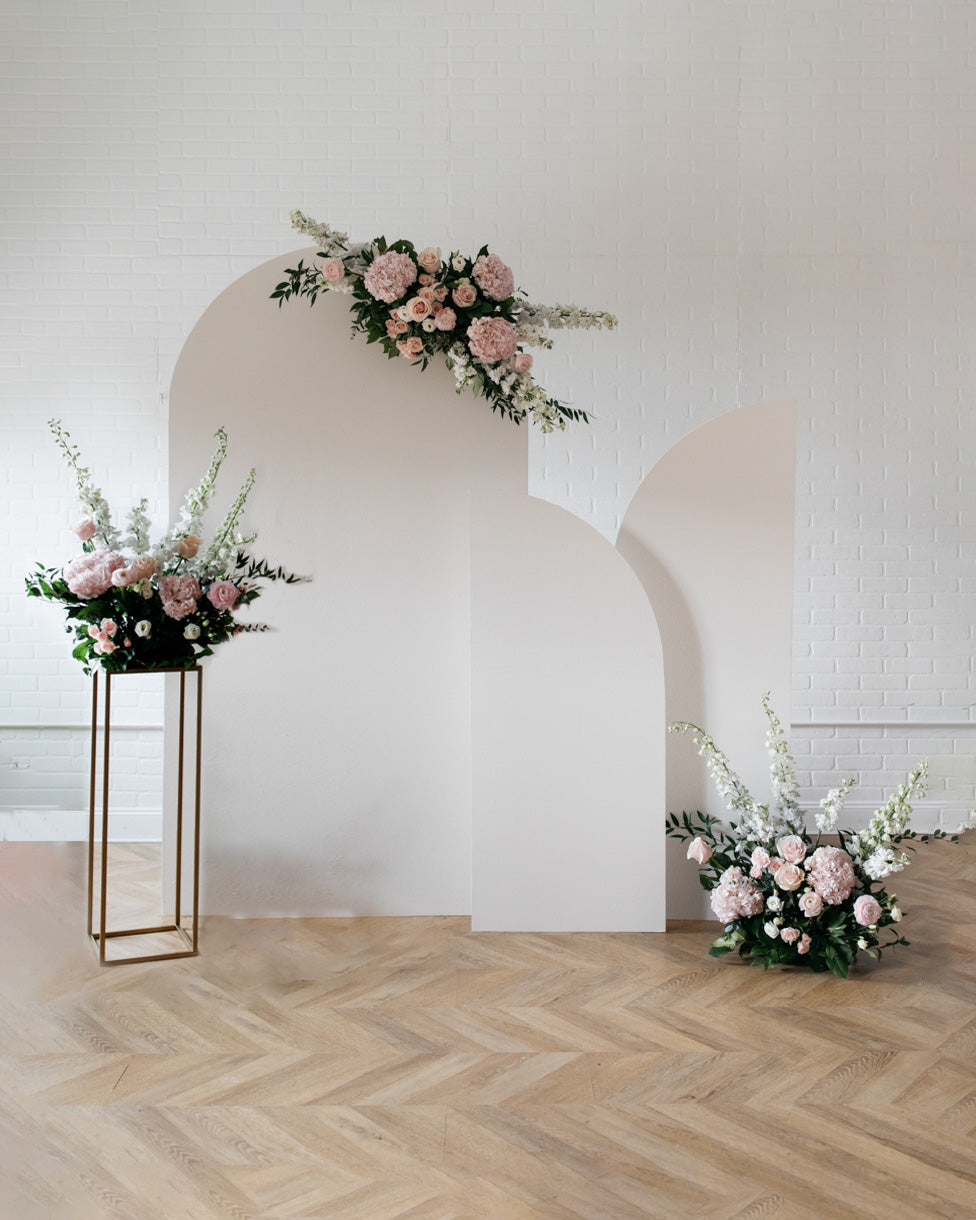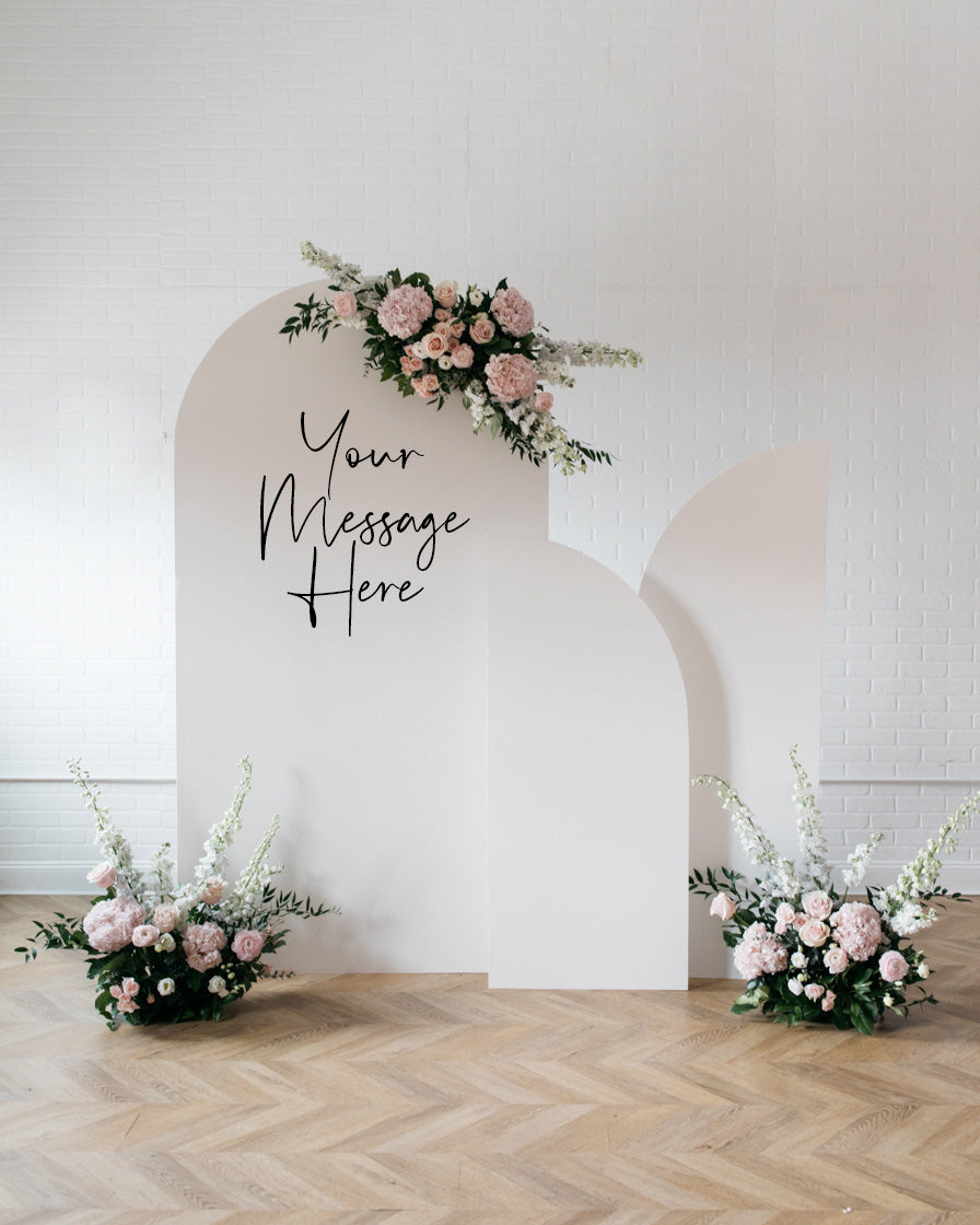 Elevate your celebration effortlessly with our panel and floral burst set. Modern design meets sophistication with timeless white panels and a captivating rich burst of florals. It's Ready-To-Party™ — we handle installation and styling, so you can simply enjoy.