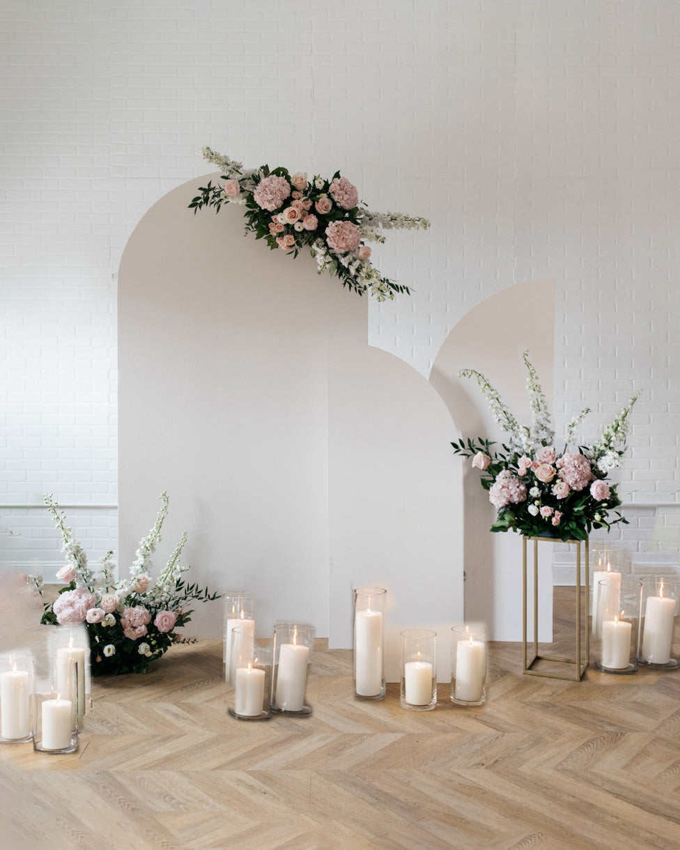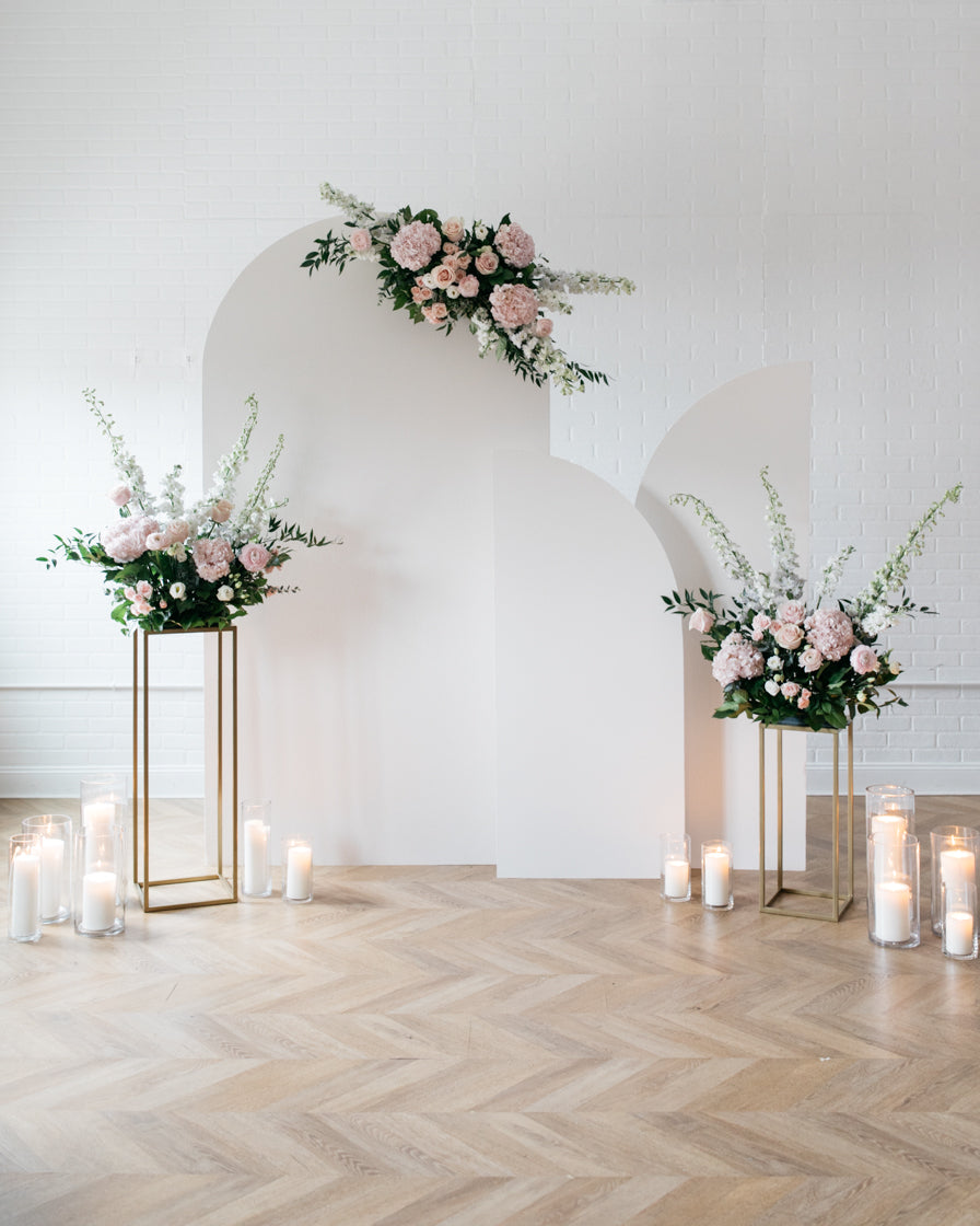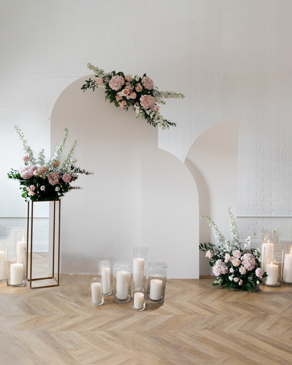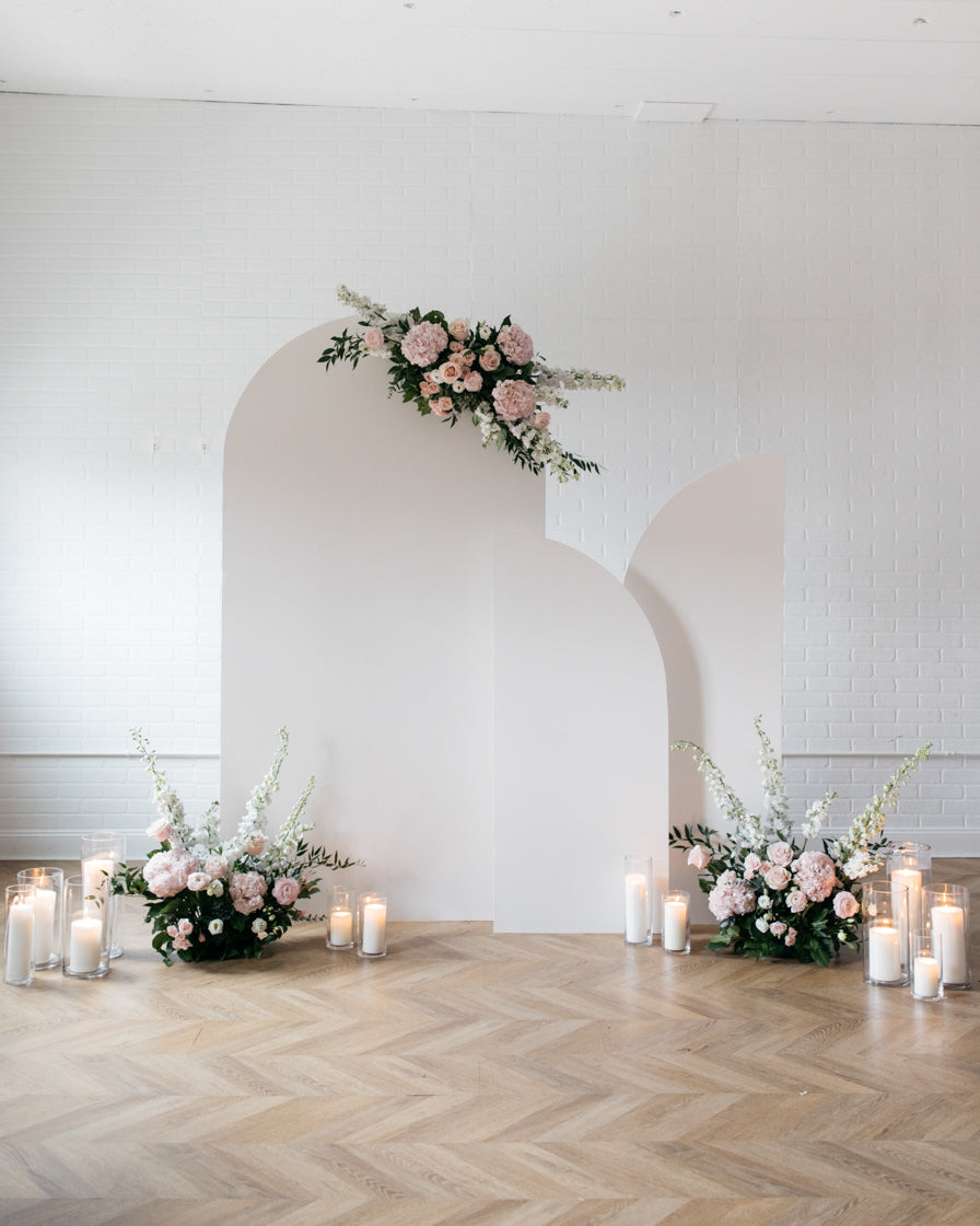 Elevate your celebration effortlessly with our panel and floral burst set. Modern design meets sophistication with timeless white panels and a captivating rich burst of florals. It's Ready-To-Party™ — we handle installation and styling, so you can simply enjoy.