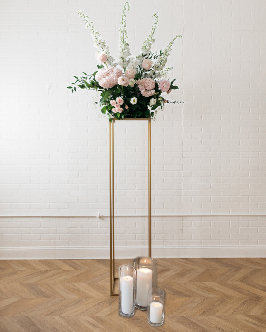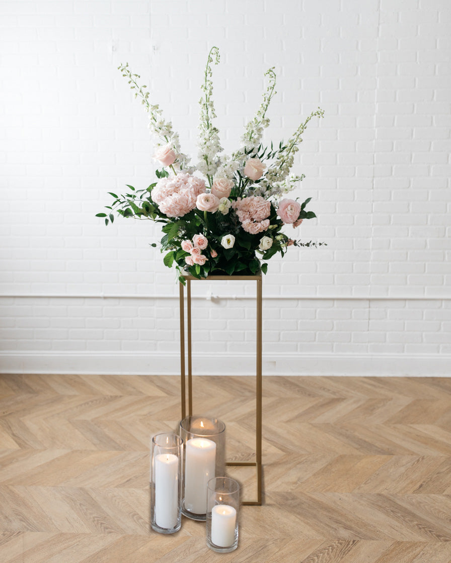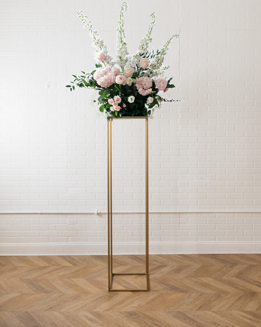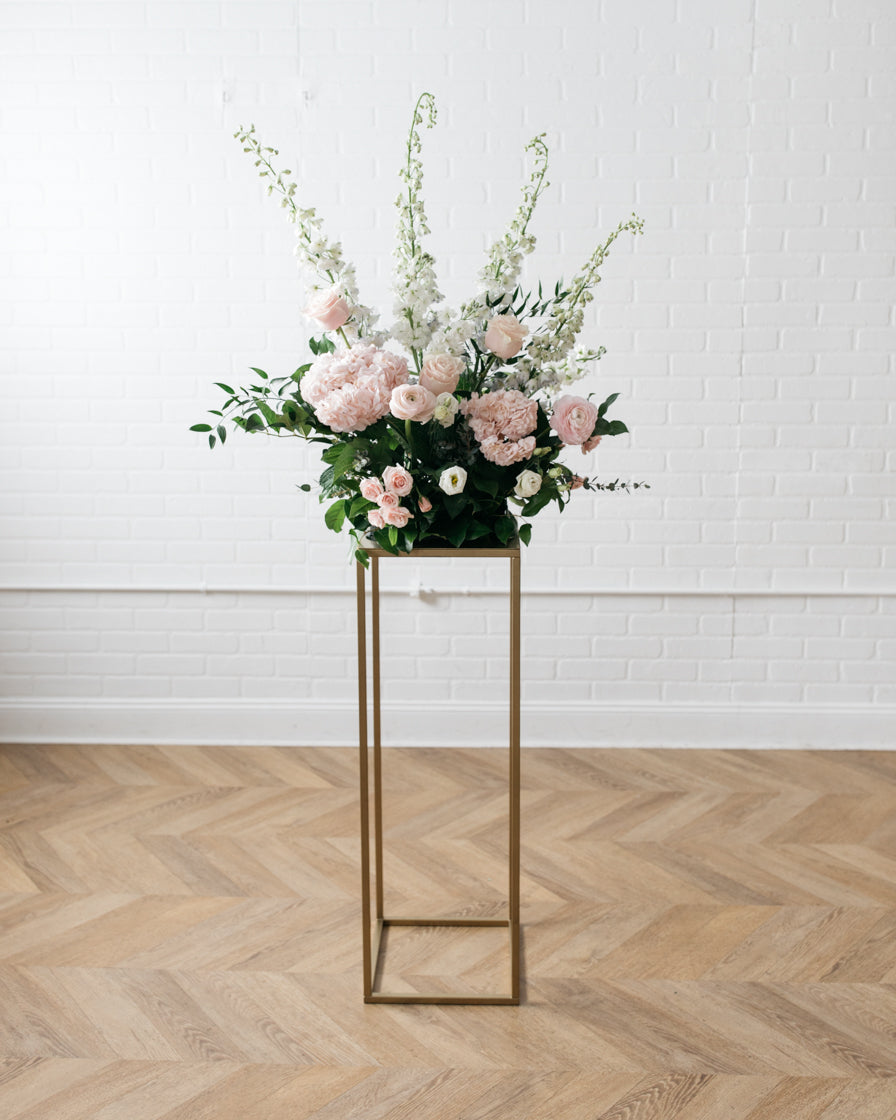 Elevate your Timeless event with our exquisite floral arrangements on gold stands, a perfect blend of sophistication and lush beauty. Designed to add dimension and height to any space, these stunning pieces feature sought-after florals, including cream blooms intertwined with greenery, creating a romantic and timeless ambiance.