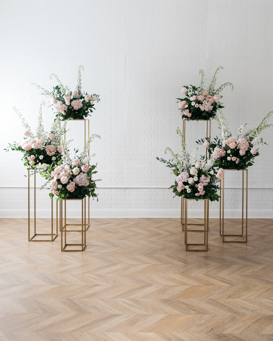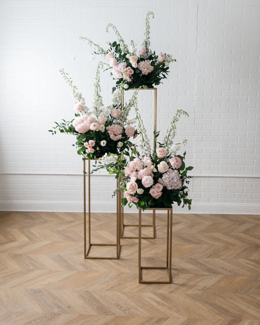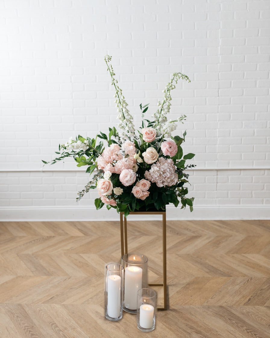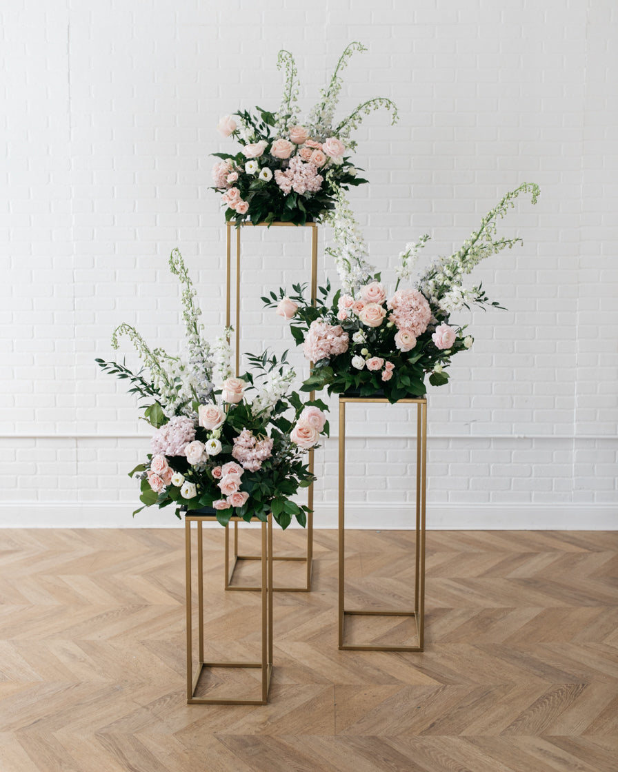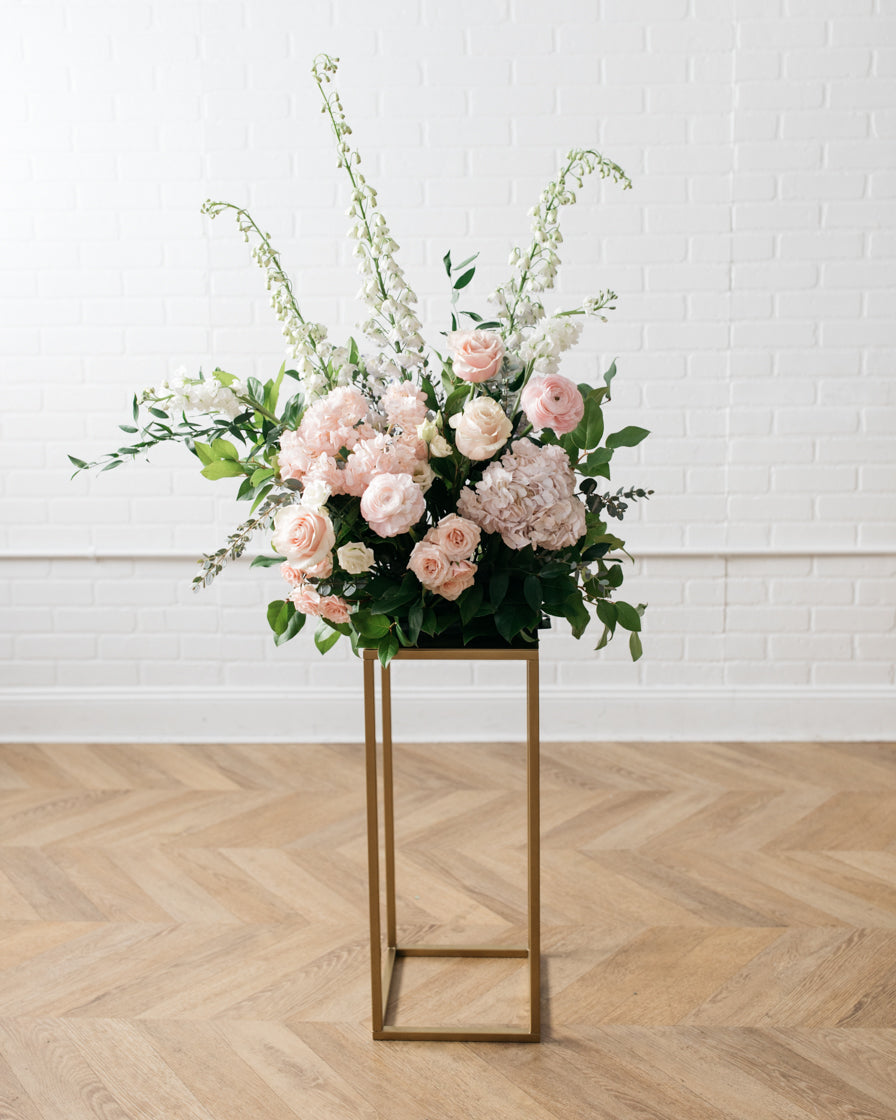 Elevate your Timeless event with our exquisite floral arrangements on gold stands, a perfect blend of sophistication and lush beauty. Designed to add dimension and height to any space, these stunning pieces feature sought-after florals, including cream blooms intertwined with greenery, creating a romantic and timeless ambiance.