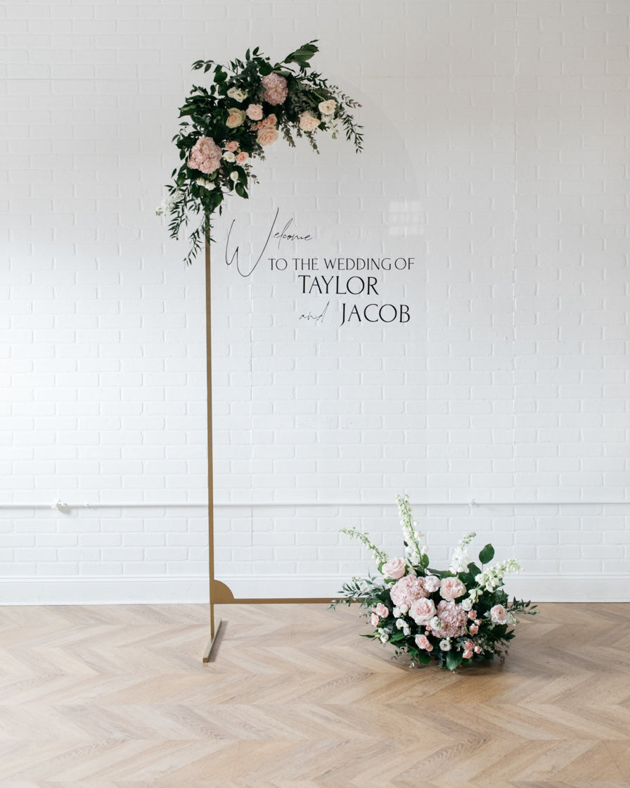 Welcome your guests in style with our Natalie Sign, a stunning clear sign encased in a gold frame, adorned with a personalized message. Complete with a beautiful floral burst and optional floral jardinieres for added impact, this piece is both modern and sophisticated. Enjoy hassle-free installation by our team.