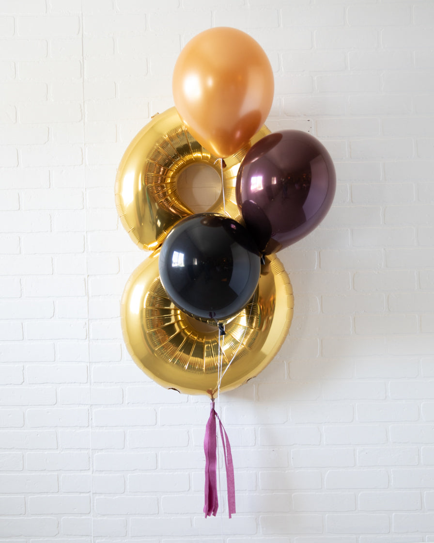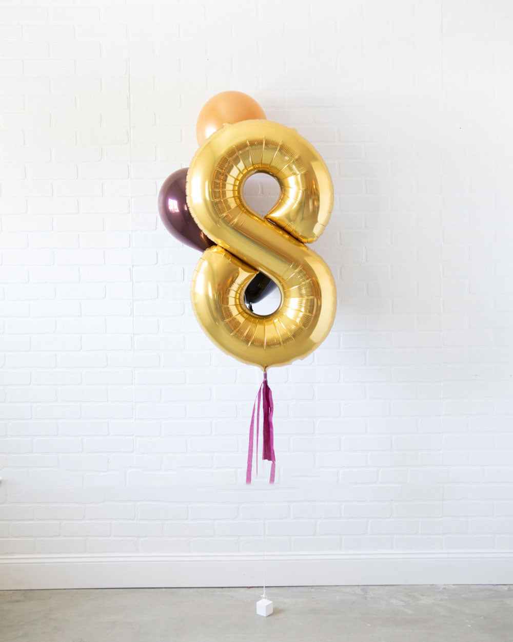 Everyone's favorite, the 34in foil number and skirt turned into a bouquet. This includes a gold number balloon and bright helium filled balloons for an effortless look. Great as decor or as photo prop.