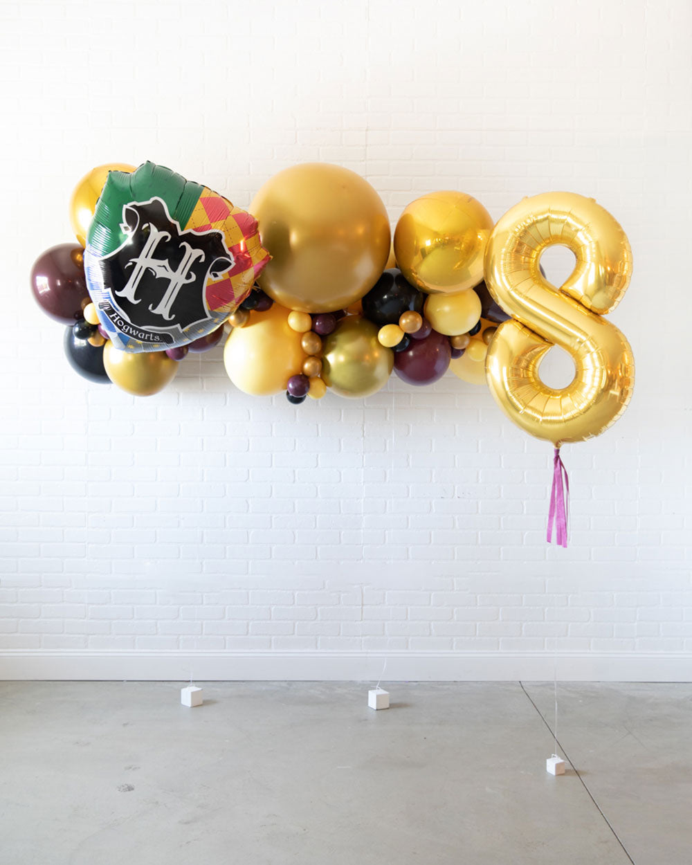 Put the ultimate party together with this Harry Potter balloon birthday set. This set includes a floating balloon arch including a Hogwarts Shield and gold foil number. In bold shades, this works perfectly for a little boy's Harry Potter themed birthday party.