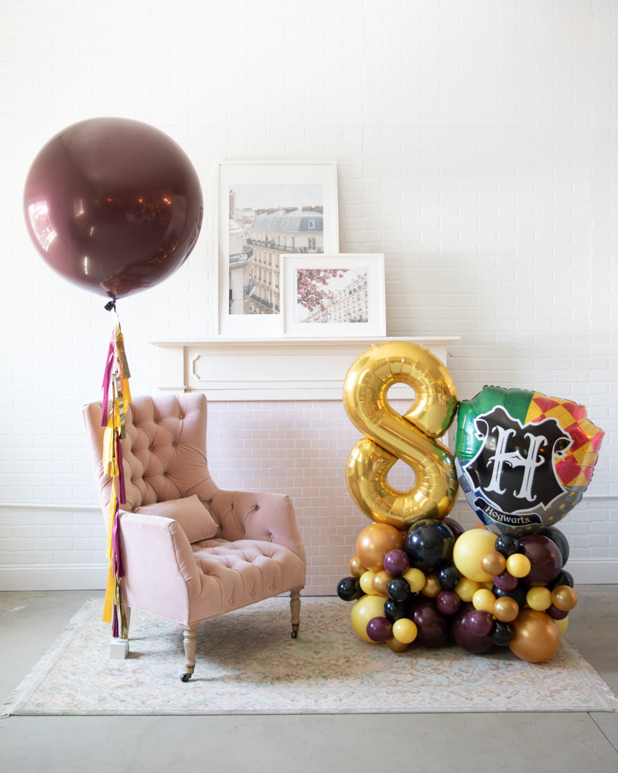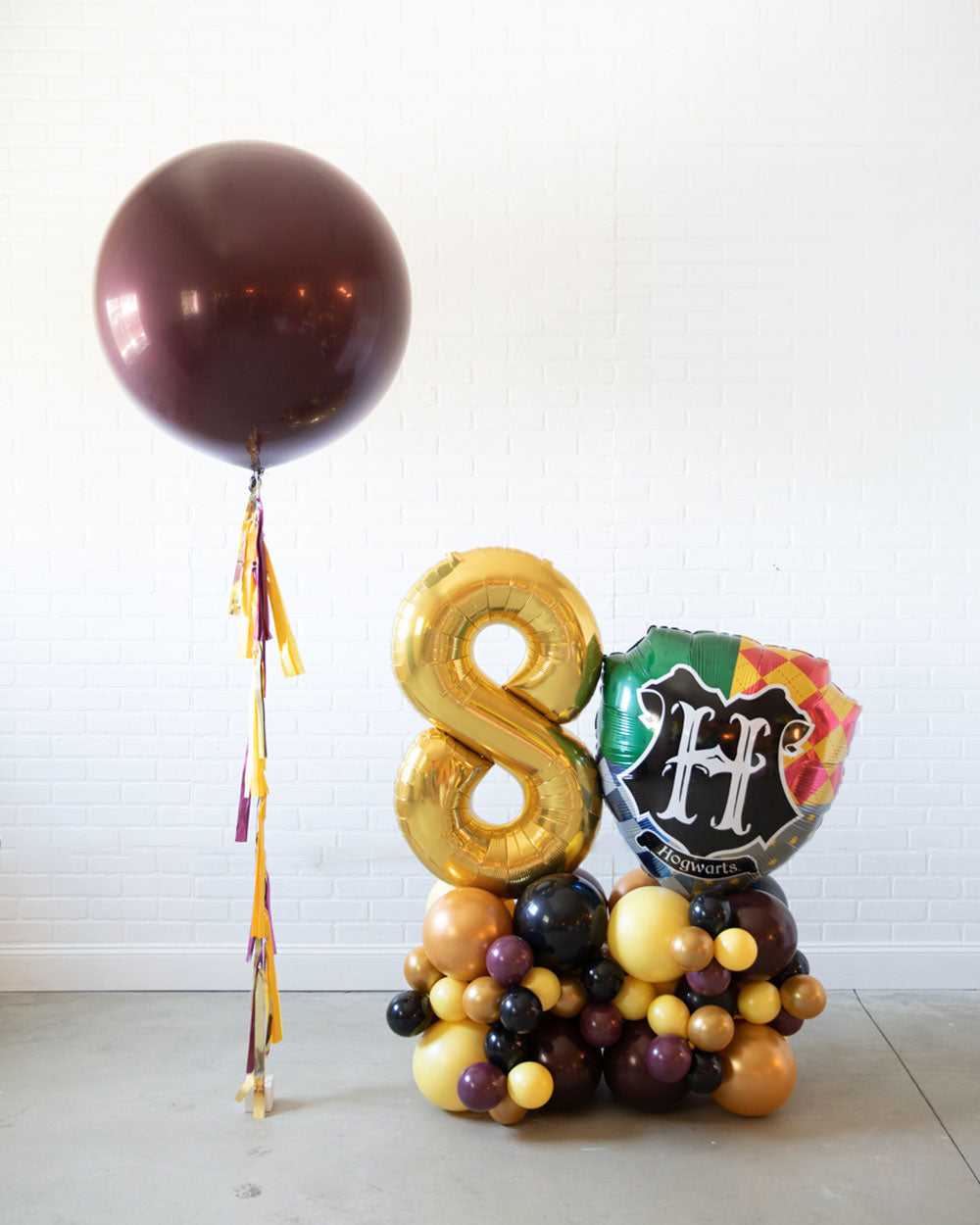 Make a bold birthday statement for a fun Harry Potter themed kids birthday! Use this giant balloon with tassel garland and number pedestal to dress up any space! This design includes a gold mylar number and Hogwarts Shield mylar balloon for extra fun.
