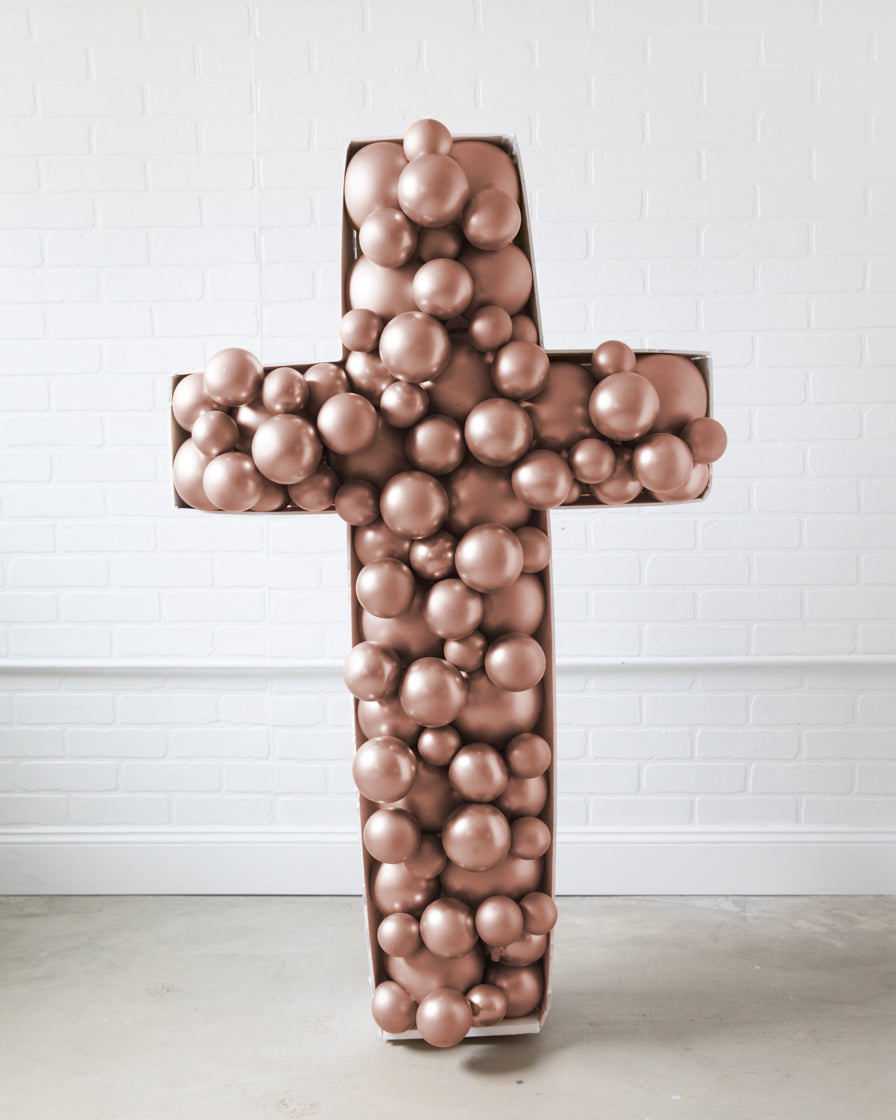 Add some style to your baptism or first communion party! This beautiful balloon cross mosaic is a versatile decor piece that can dress a sweets table, entryway or photo op section.