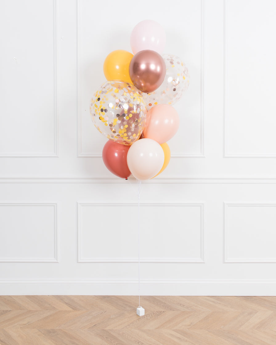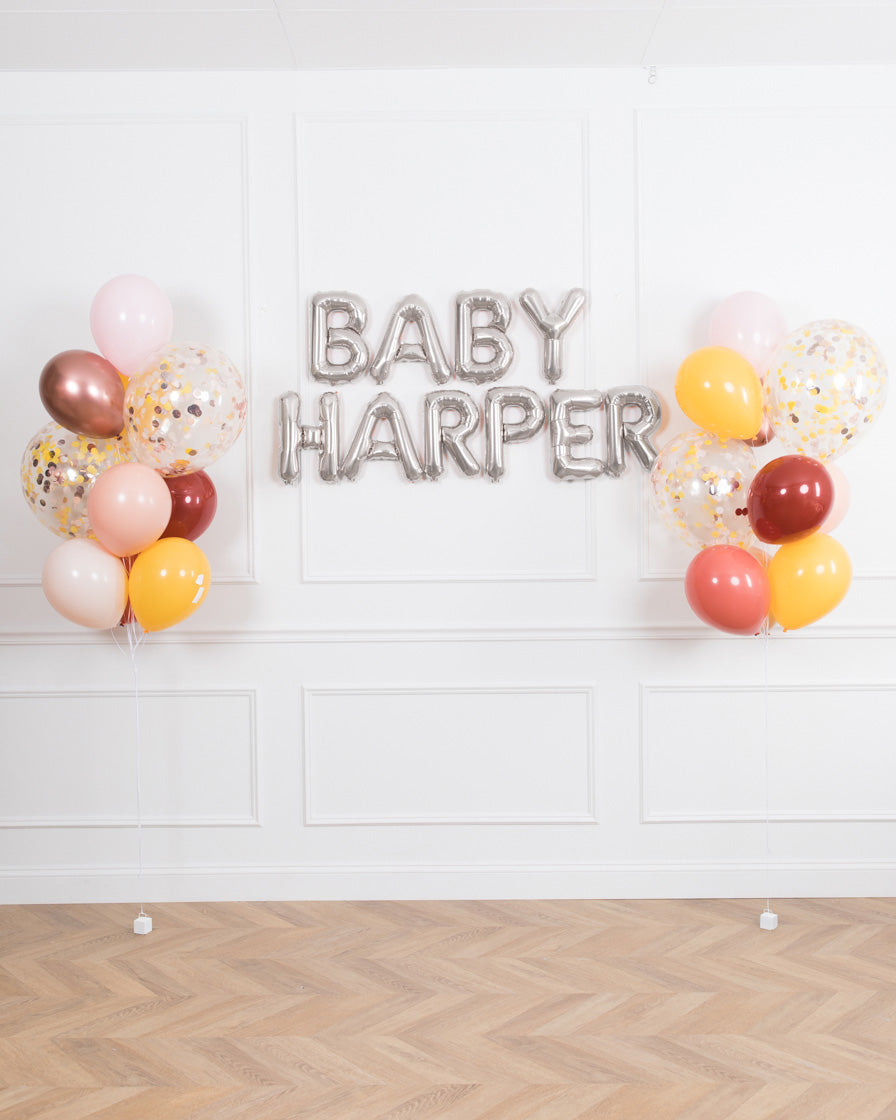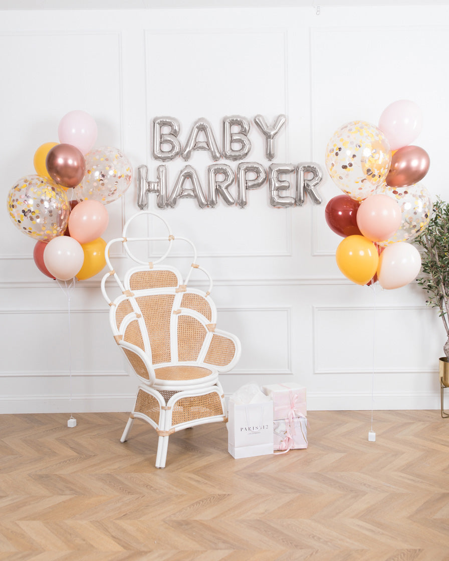 Fill the room with this super sweet balloon set! This includes 2 confetti balloon bouquets and rose gold letters spelling out BABY and the name of your choice to create an easy and festive backdrop.