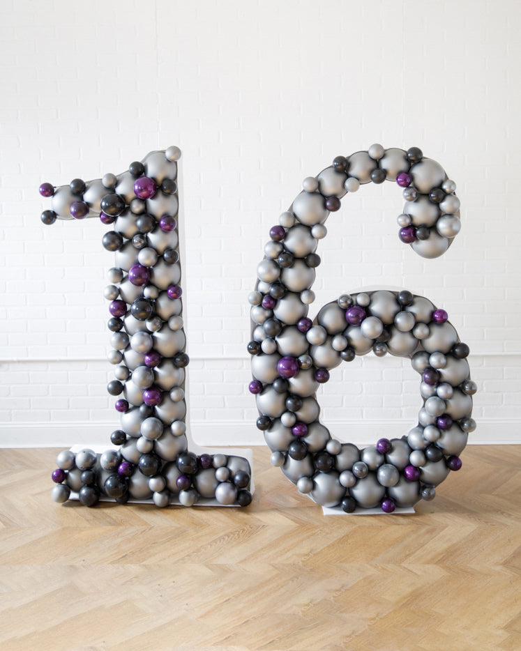 An eye-catching balloon piece fit for an outdoor event. These balloon mosaic numbers with bold colored balloons, perfect for a backdrop, sweets table and more! Complete the look with balloons from this collection.