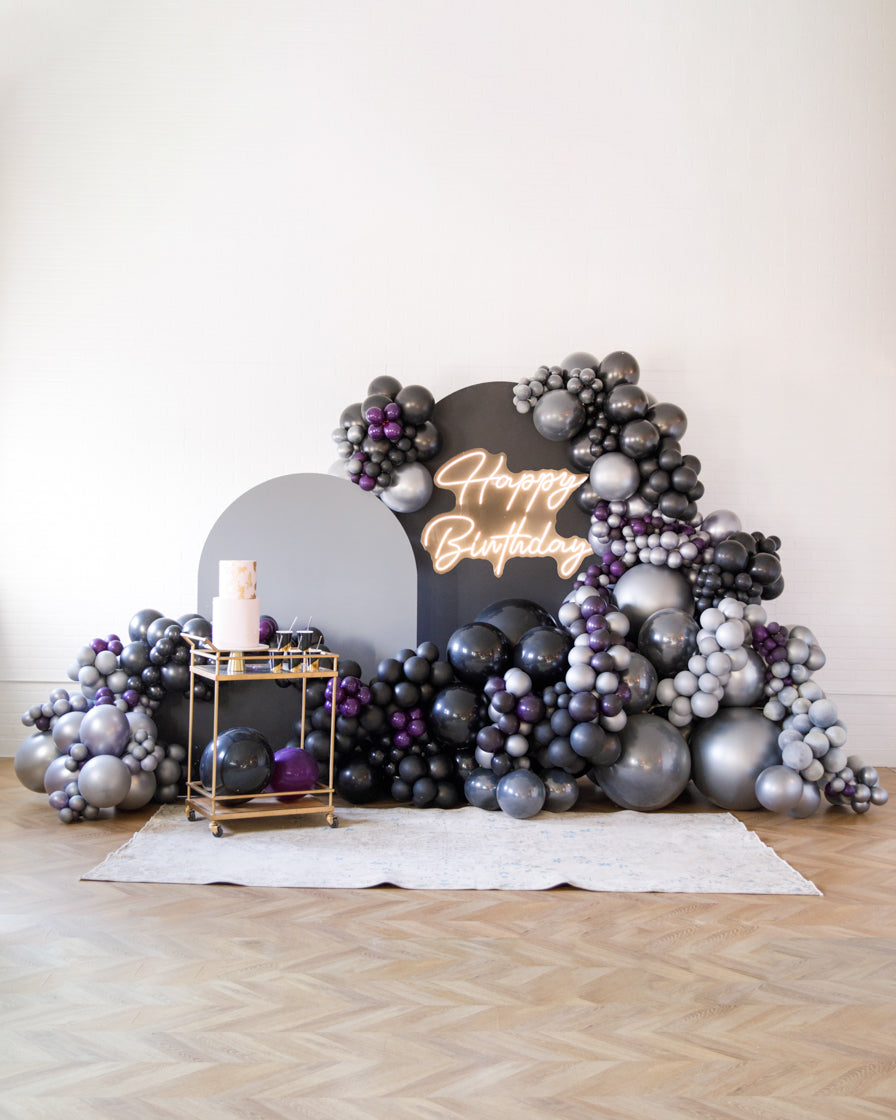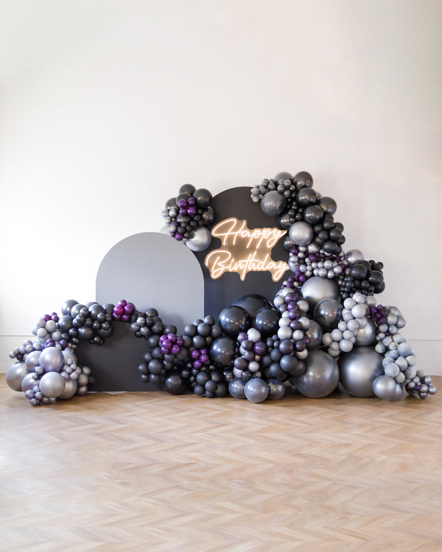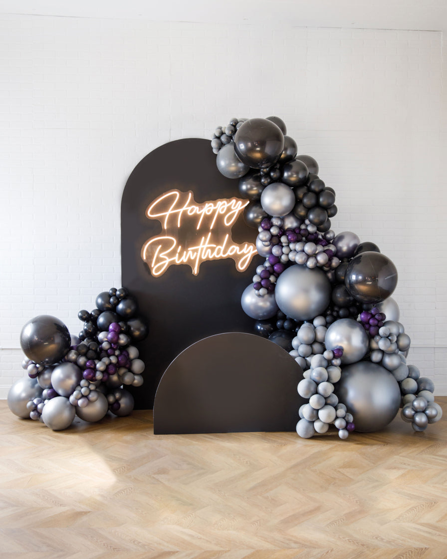 Stand out in style with this panel and balloon garland design. This includes a panel backdrops, neon happy birthday sign and organic balloon garlands to match. Add foil accents to make your photo backdrop stand out even more!