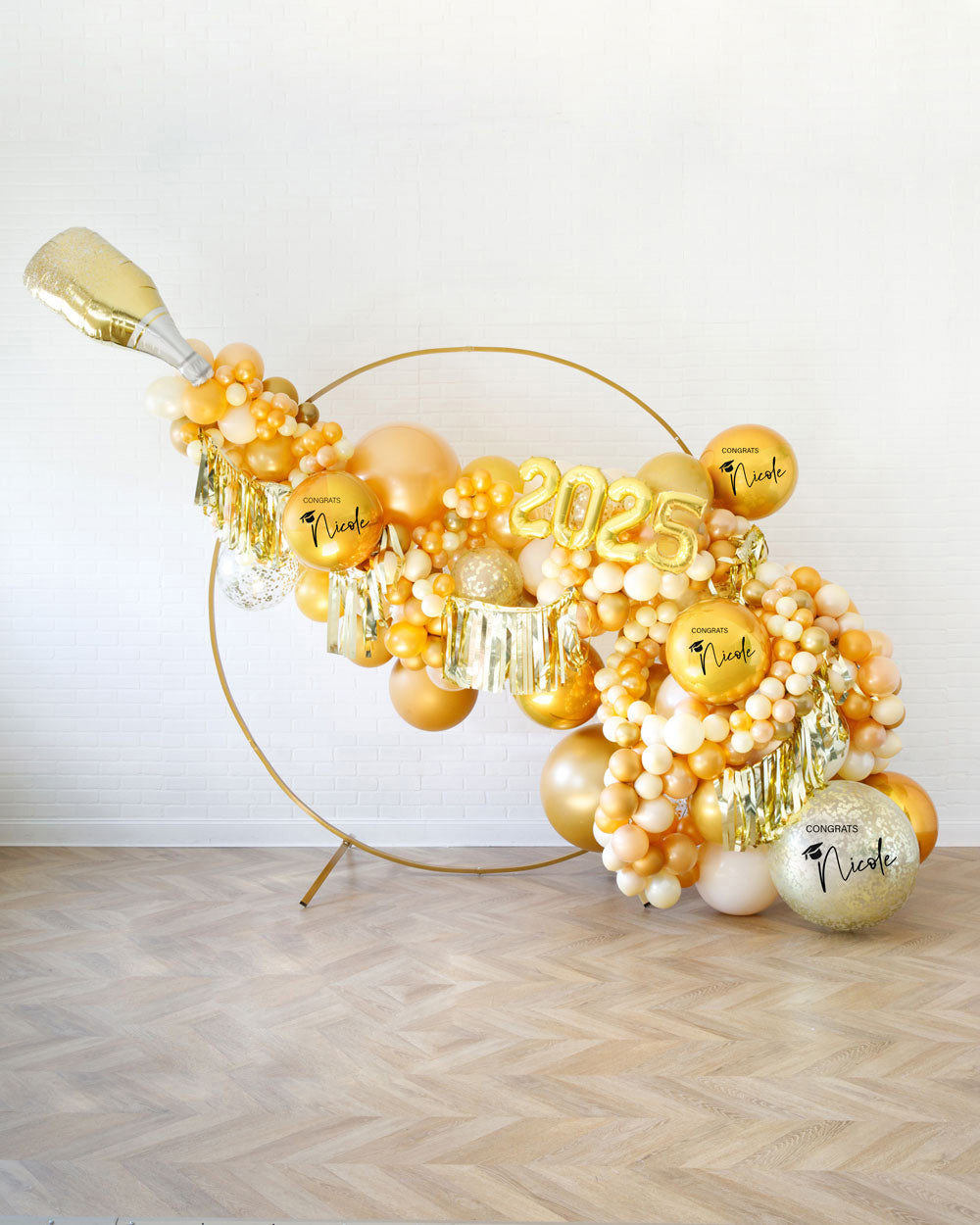 Pop the champagne and start celebrating your 2025 Grad in style! This circle frame with balloon garland set is the ultimate way to cheers this milestone accomplishment! Add more foils to glam up your graduation.
