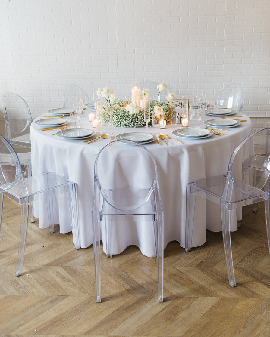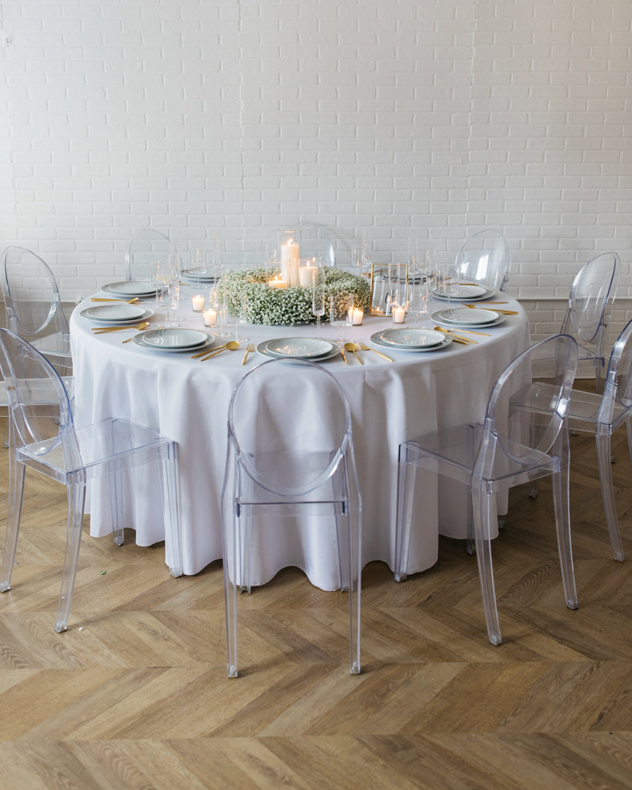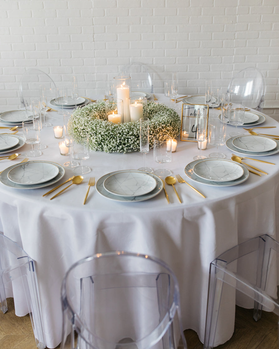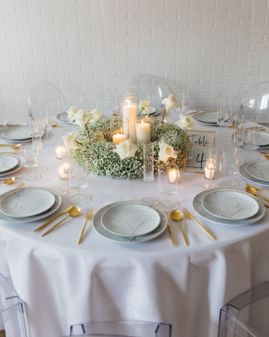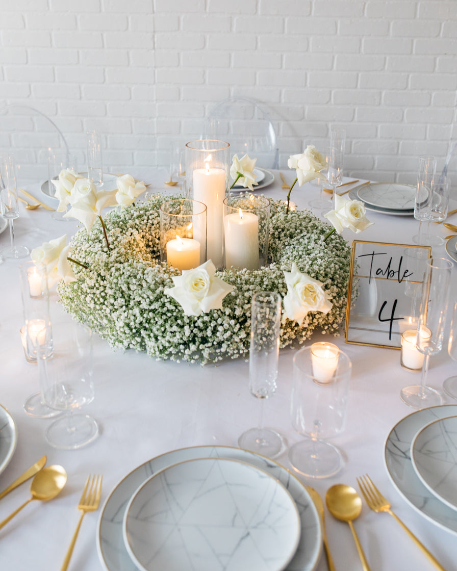 Elevate your wedding decor with our Minimal Floral Wreath and Candle Centerpiece Set. This modern ensemble, designed for the simple and modern bride, features three pillar candles in clear vases, and a wreath with baby's breath and optional white roses for understated charm.