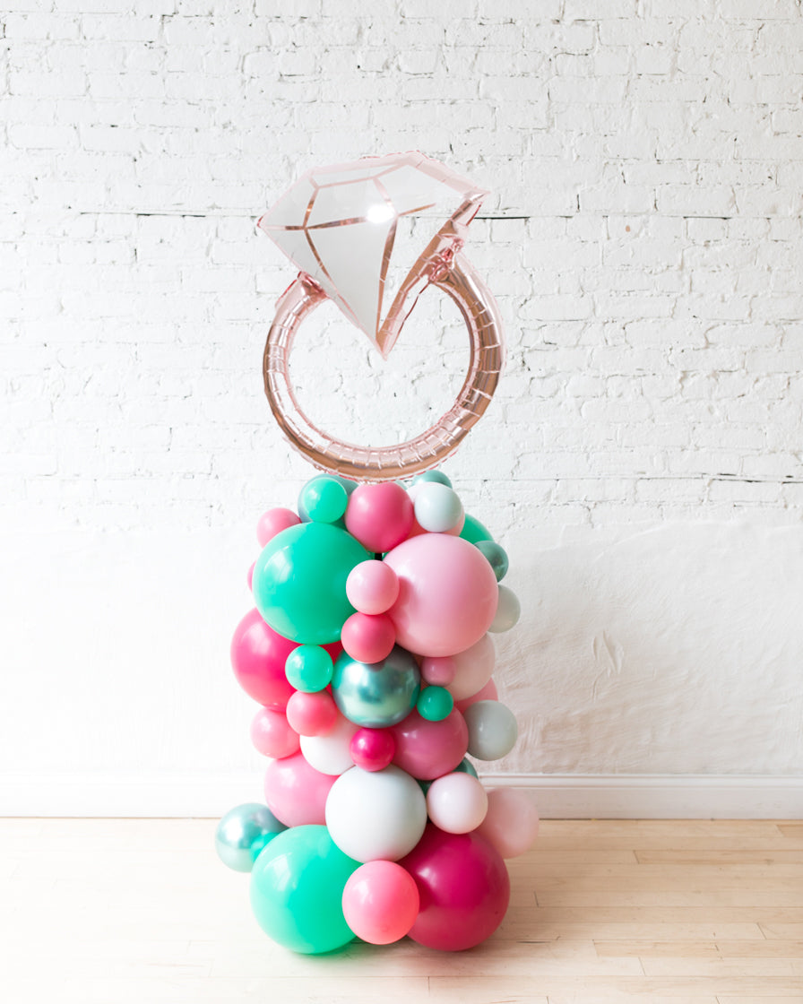 This wonderful balloon column makes for great party decor and easily transforms your outdoor space. This air filled balloon design includes a metallic diamond ring balloon fit to dress up a sweets table, doorway and more!