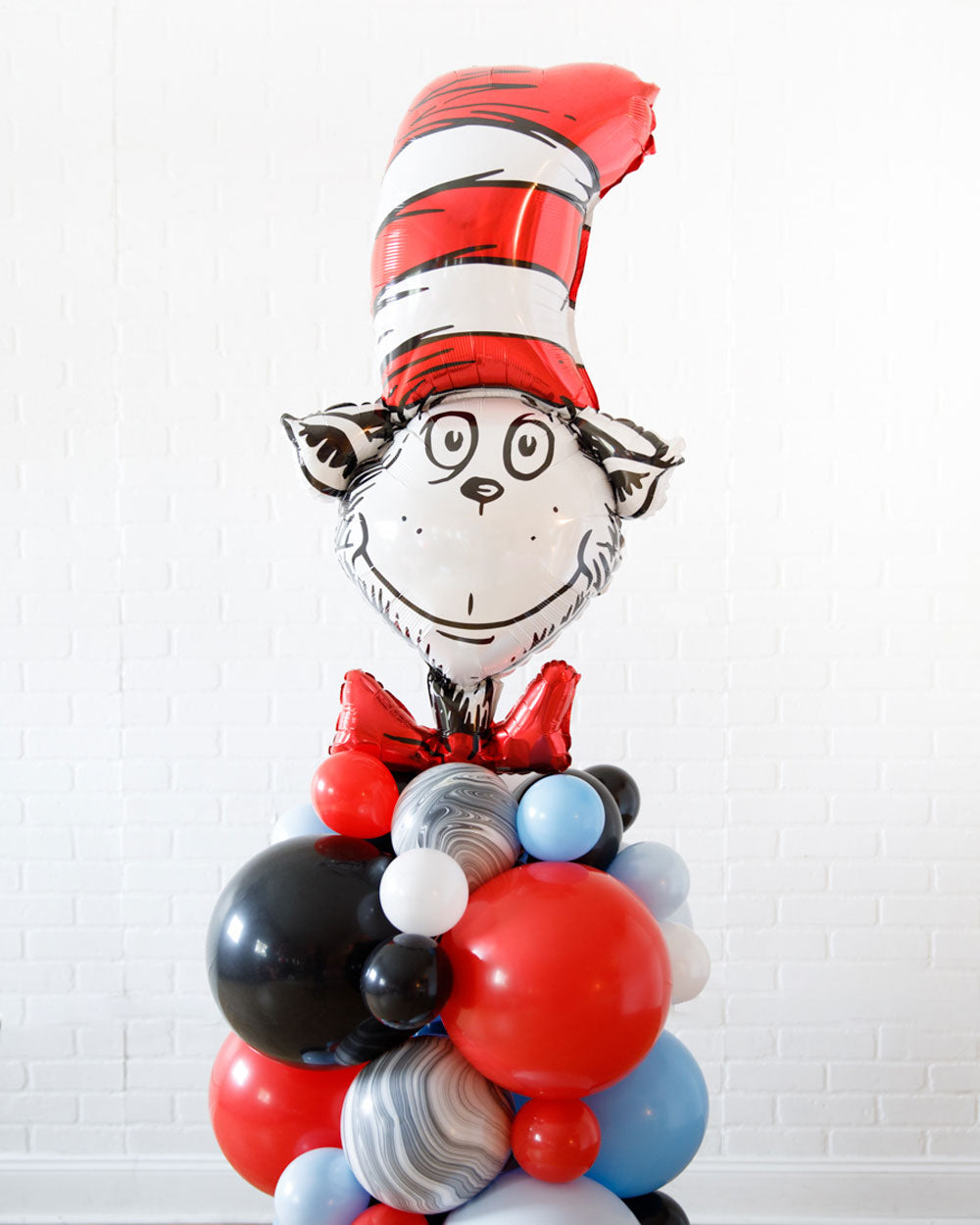 Our Dr. Seuss inspired balloon column is a hit for your little ones birthday party! Created with air filled bright balloons and topped with a Cat in the Hat balloon, this arrangement is perfect for a birthday of any age. Use this for a sweets table or part of your photo backdrop.