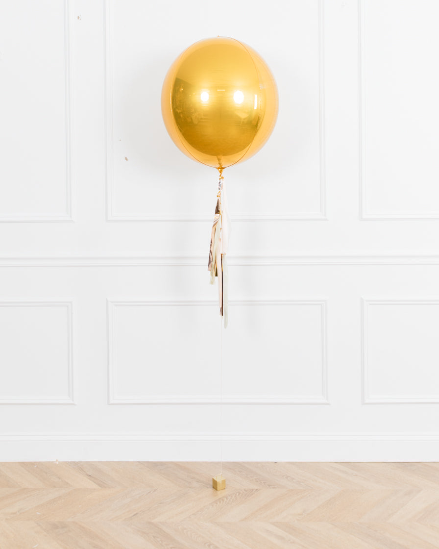 An elegant option that always makes an impression. This helium-filled gold orb balloon with tassel garland is an easy way to decorate a shower.