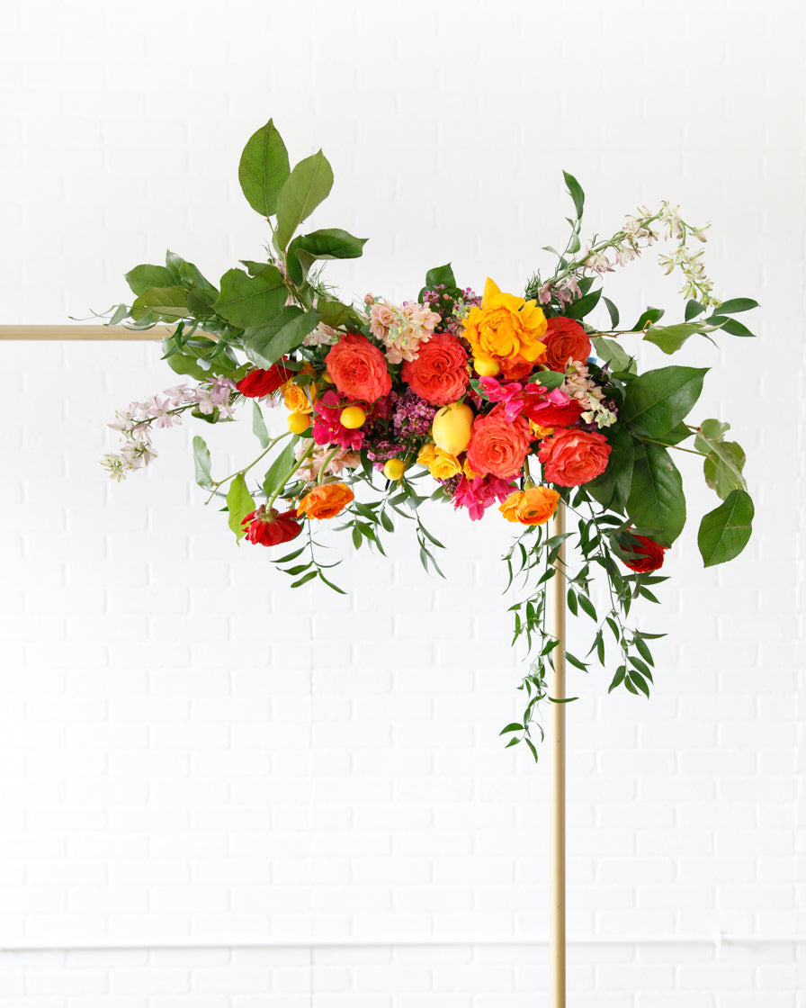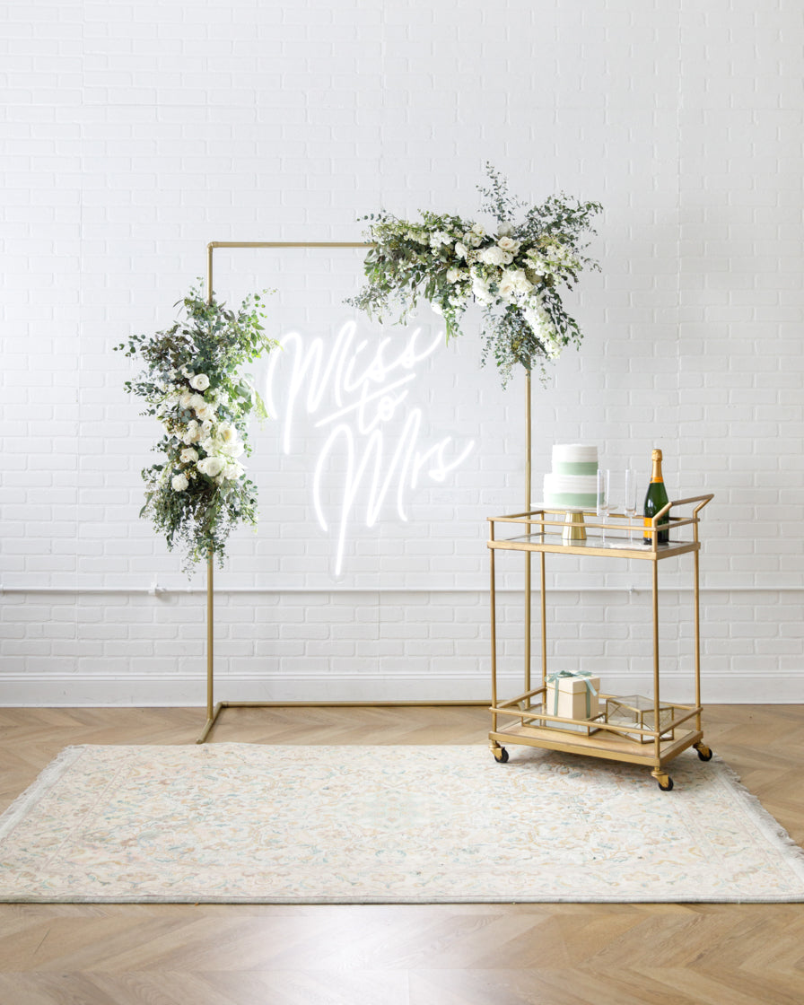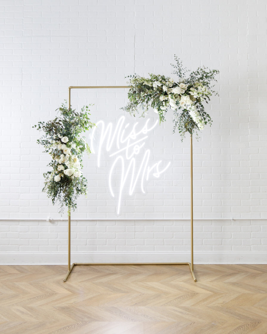 Elevate your event with this frame and floral pair. With our signature gold frame and two statement making floral arrangements. With our signature Miss to Mrs Neon sign, her event will truly light up. This works perfect for a Photo Backdrops, gift opening, or an entryway.