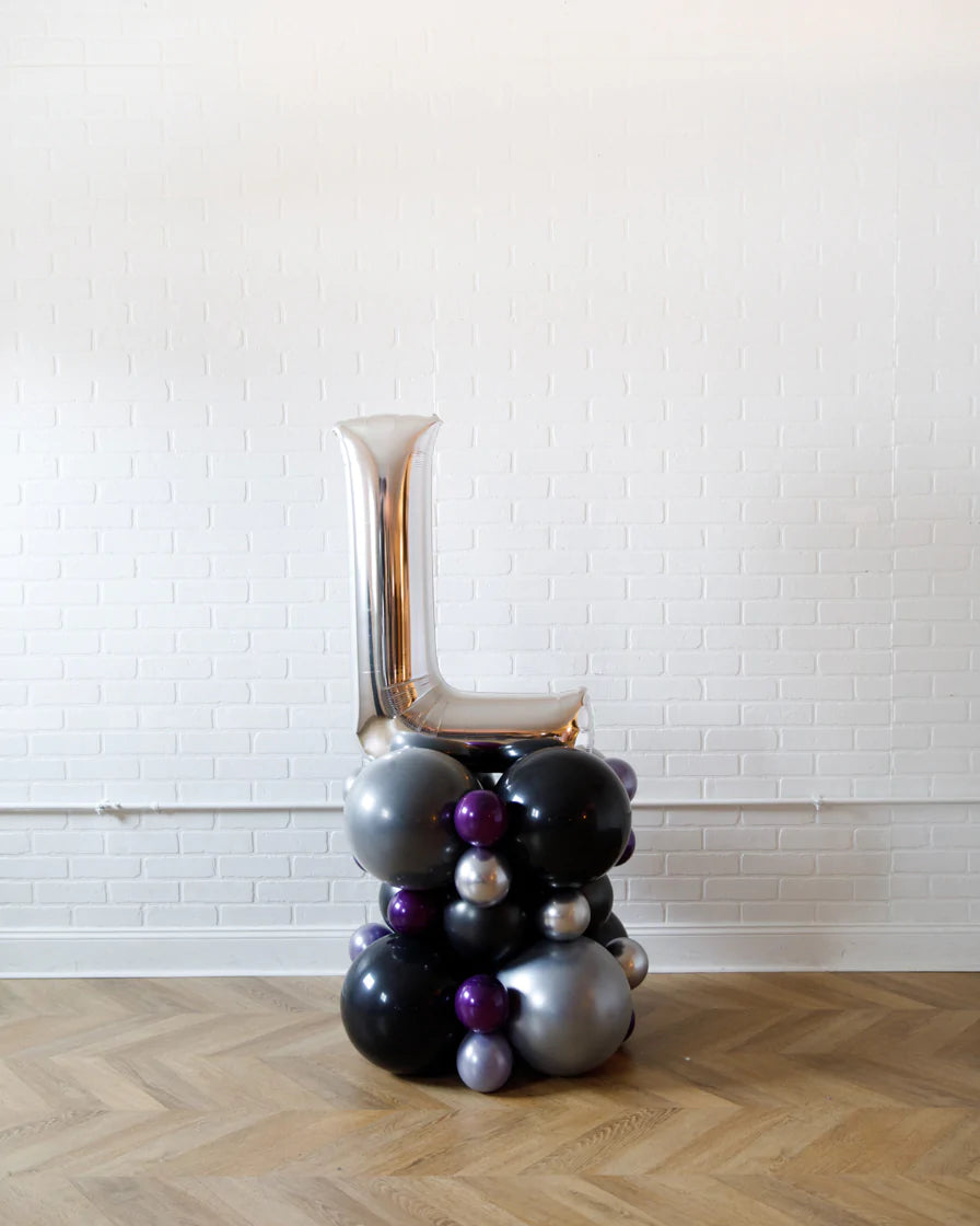 Make a statement with our name pedestal balloon design. This includes metallic foil letters and colorful latex balloons to create a statement making decoration in any space.