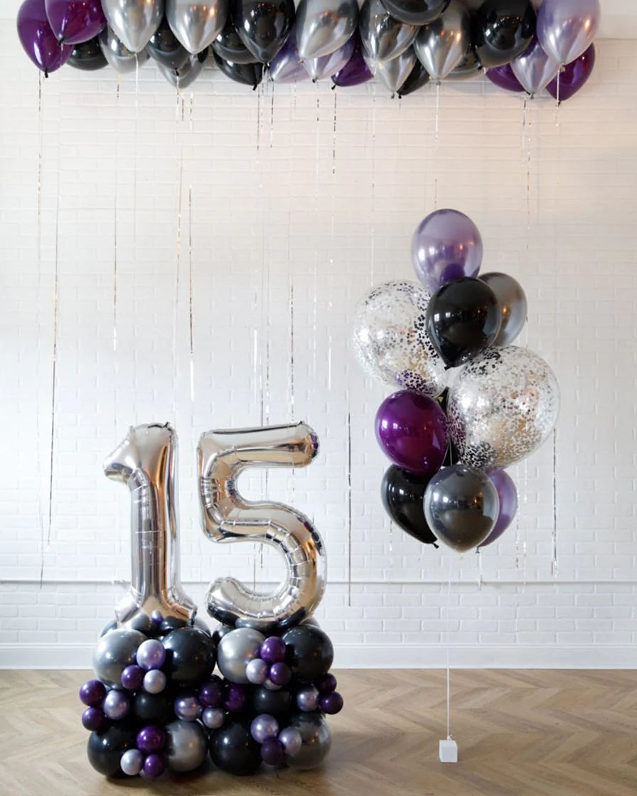 Create the ultimate birthday with this easy and festive balloon decor set. Dress up your space with plenty of glam and color, with ceiling balloon, number pedestal and confetti bouquet. Perfect for a sweets table or photo backdrop.