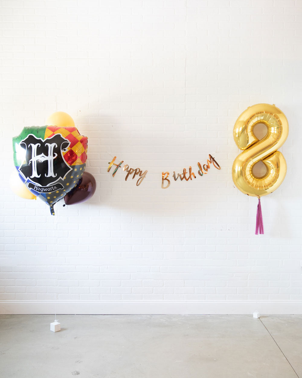 Bring your party together with this adorable and easy Harry Potter themed birthday package. This set includes a Hogwarts Shield balloon bouquet, birthday banner and a gold foil number balloon, which easily transforms any room or sweets table.